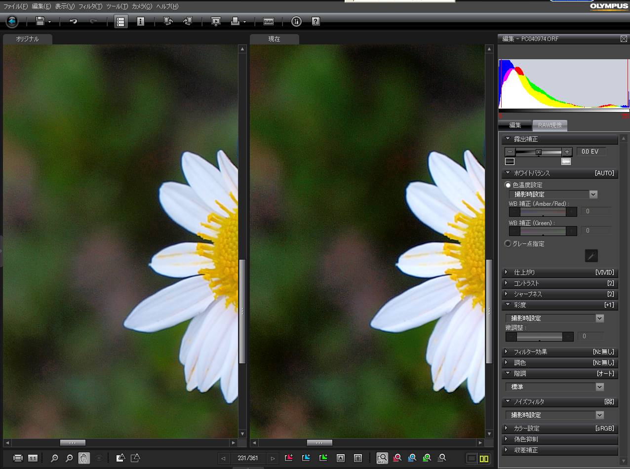 画像の左側は現像前のRAW画像。しかしE-3で設定したパラメータが反映されているもの。